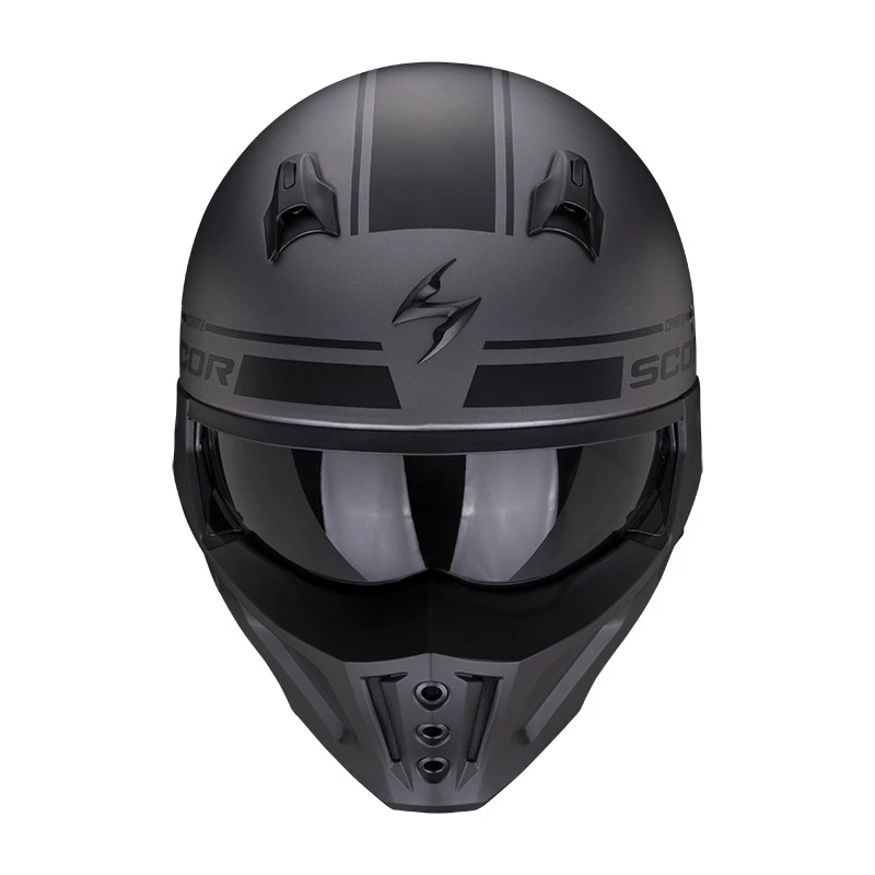 New Scorpion Covert X helmet, advanced Polycarbonate Composite Engineered Shell: Quiet, aero-tuned design for wind-tunnel tested comfort. EPS-lined chin bar for additional protection.